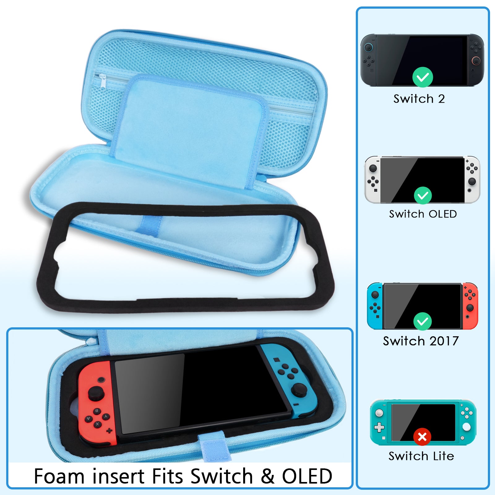 - [Compatibility] Specially designed for Switch 2(2025) / Switch(2017) / Switch OLED(2021). Use the removable foam inserts to make sure switch carrying case fits your Switch 2017 and Switch OLED 2021 perfectly.