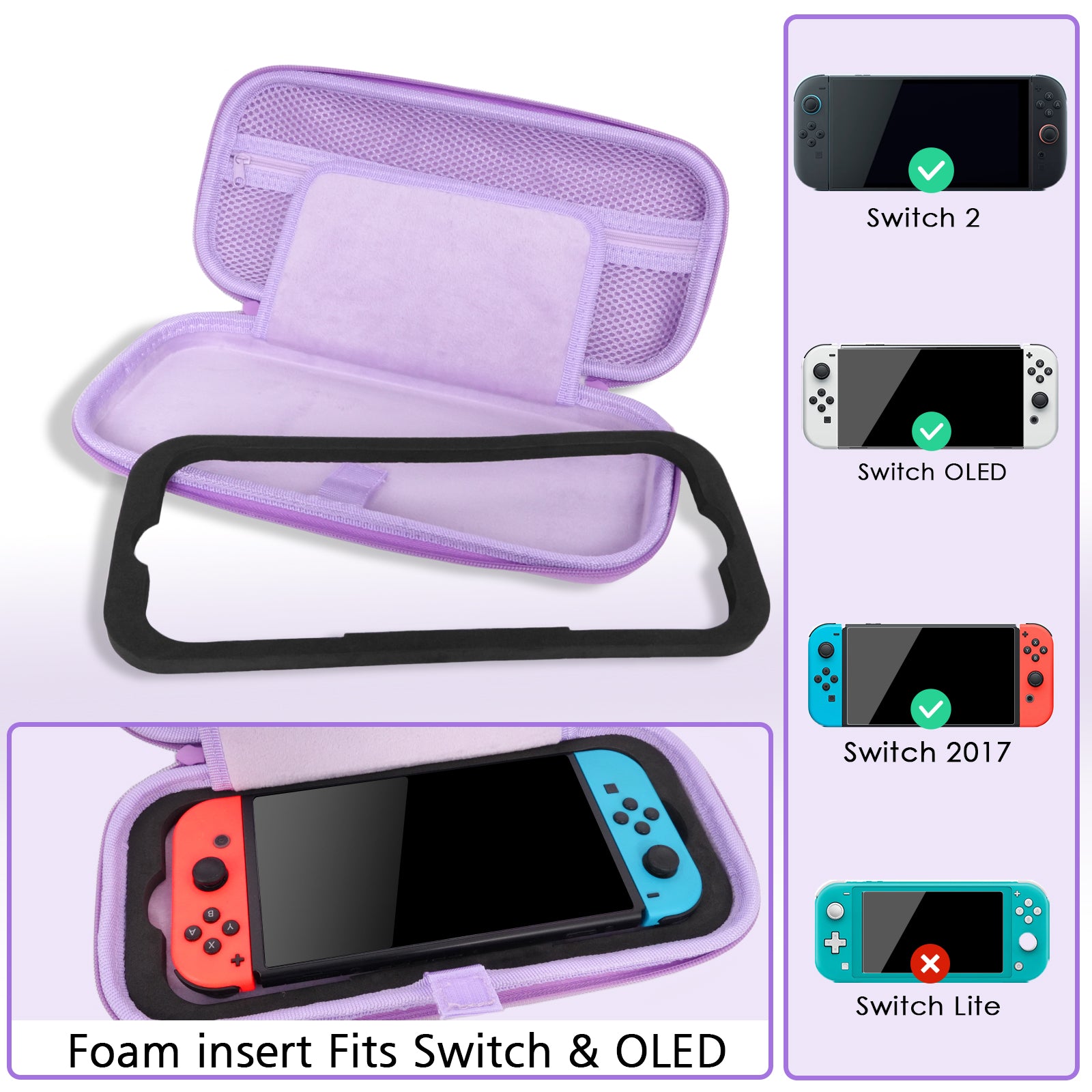 - [Compatibility] Specially designed for Switch 2(2025) / Switch(2017) / Switch OLED(2021). Use the removable foam inserts to make sure switch carrying case fits your Switch 2017 and Switch OLED 2021 perfectly.